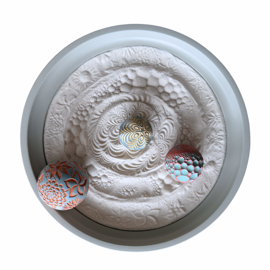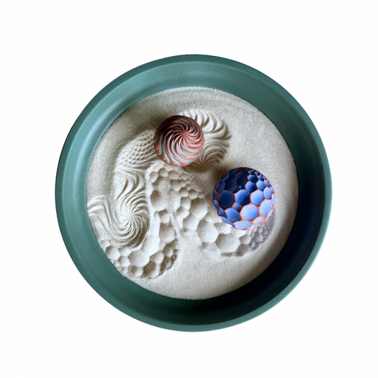 Wonderscapes provide a wholly unique, tactile art experience. They consist of a handmade wooden tray, fine crystalline sand and concrete spheres that leave meditative maps of your wellness journey.